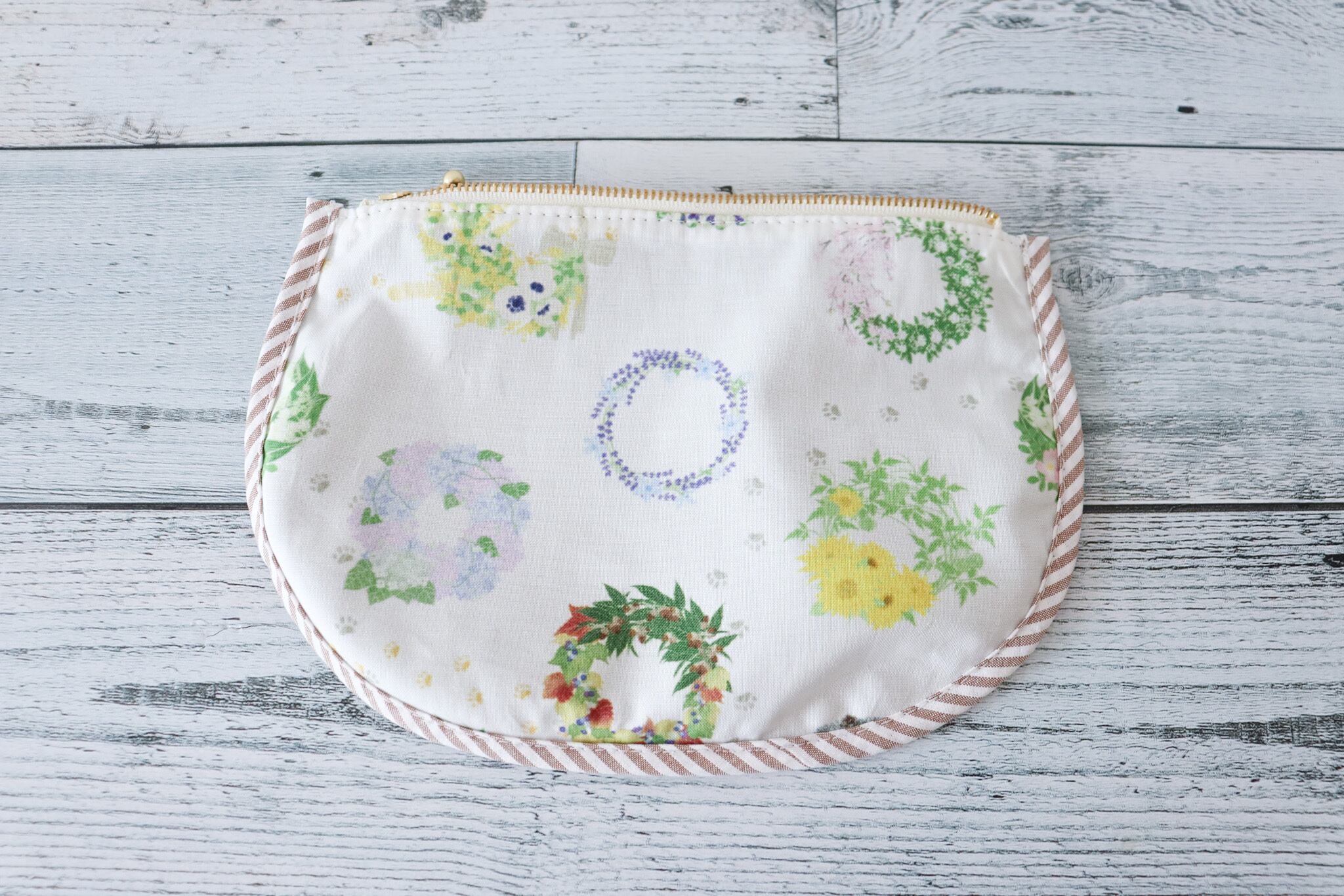 バイアステープは茶色と白のストライプ。