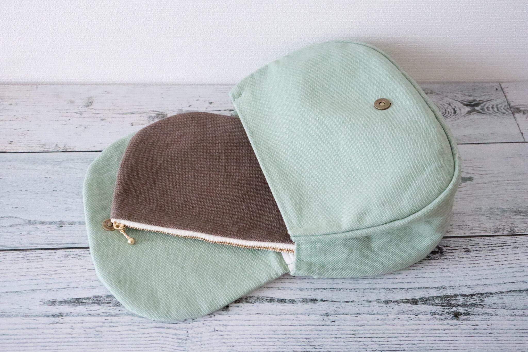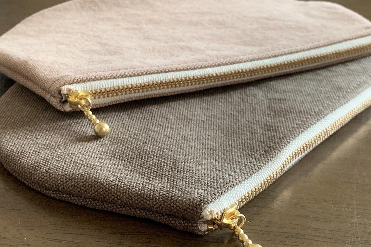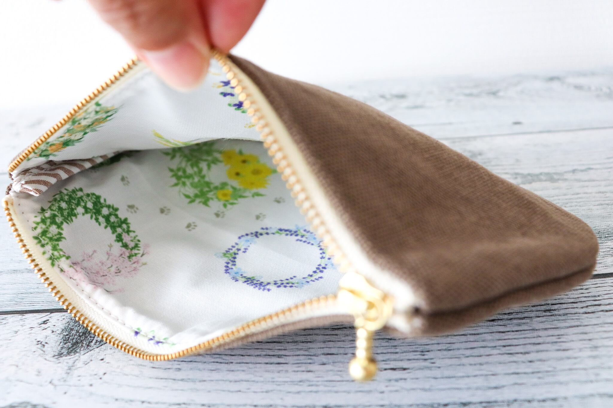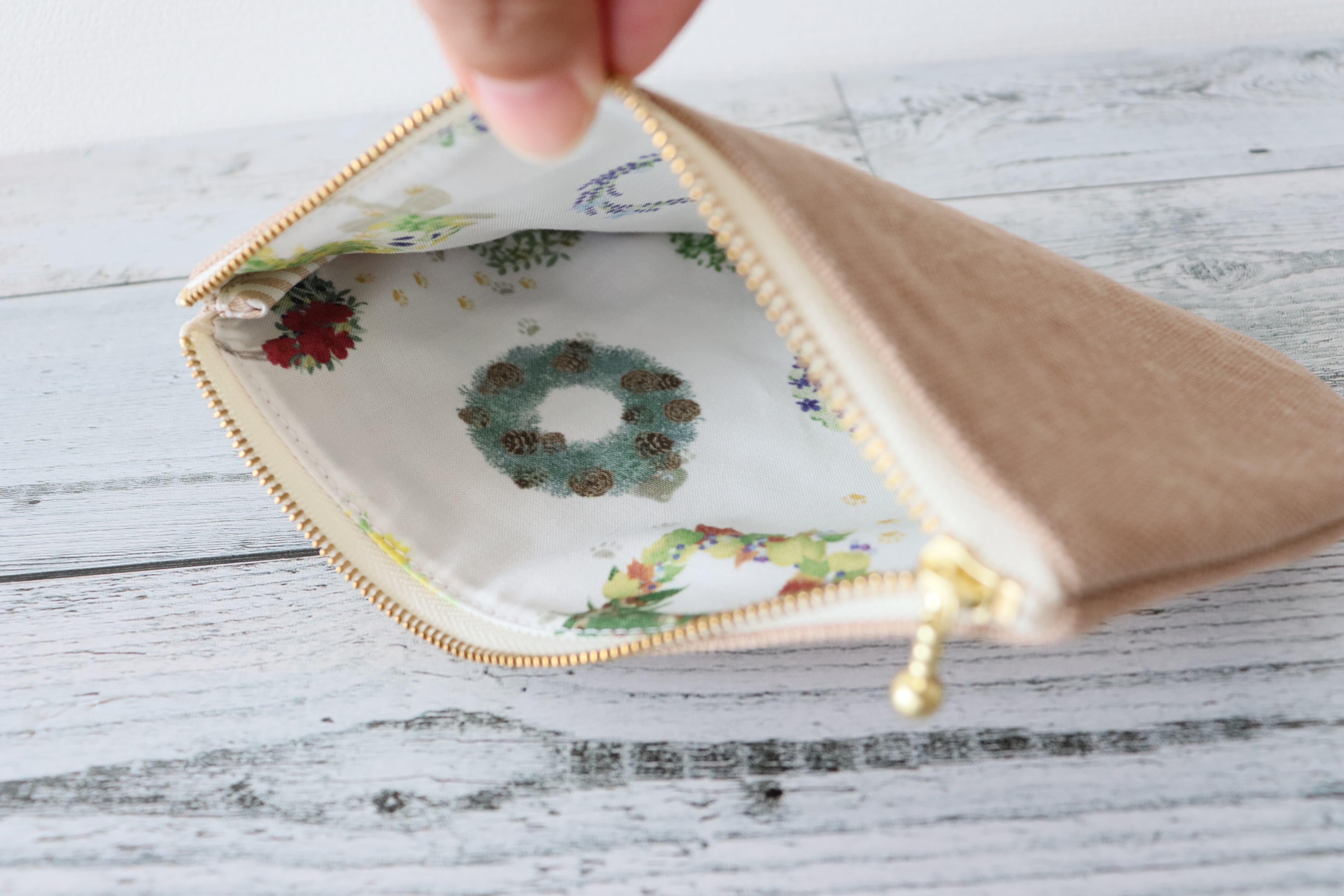 柔らかな色合いところんとした丸みや可愛らしさをそのまま、ぺたんこのファスナーポーチに。