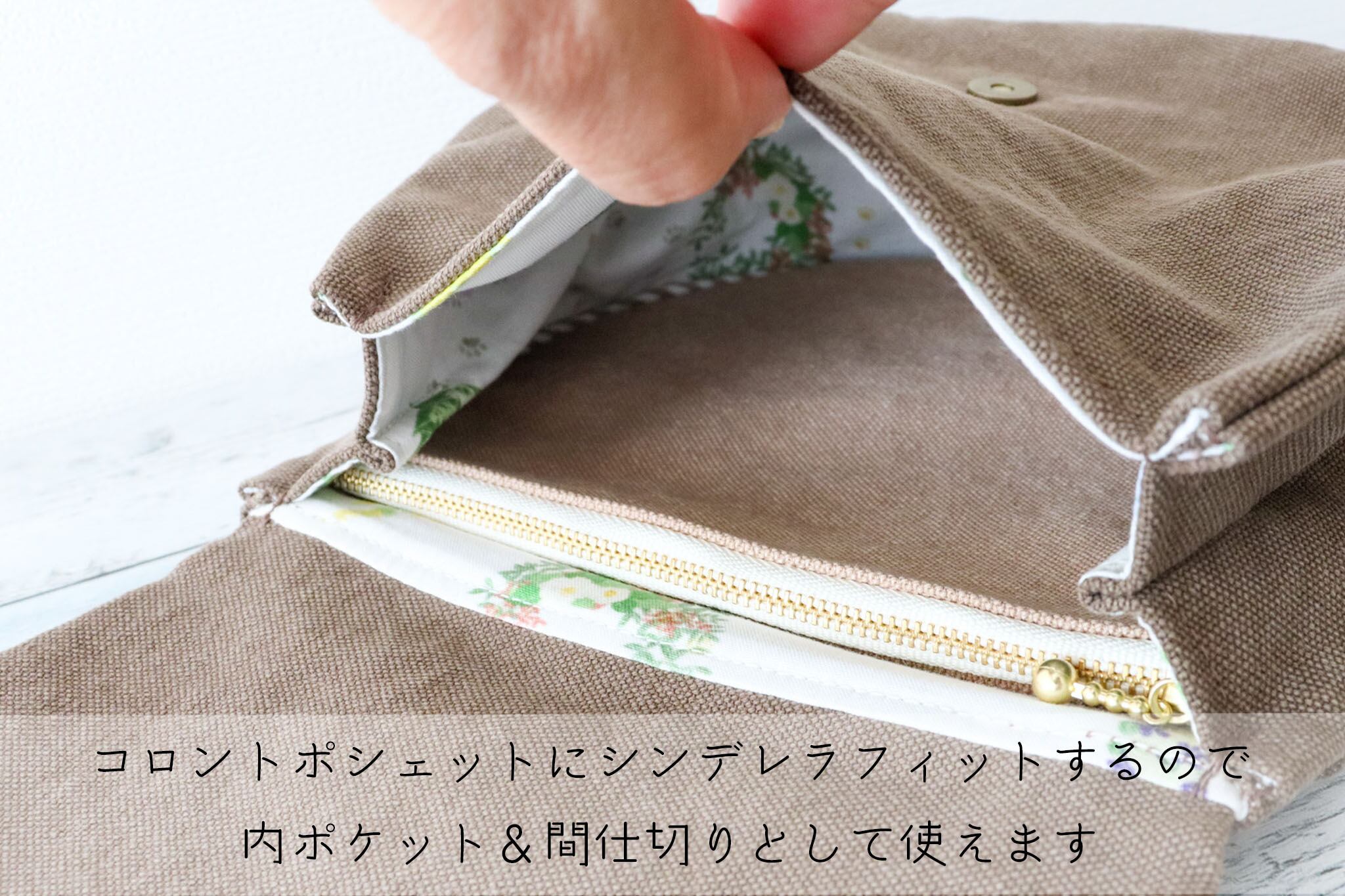 内ポケットとしてももちろん、簡易的な間仕切りとしても使え、ぜひコロントポシェットと併せて使っていただきたいポーチです。